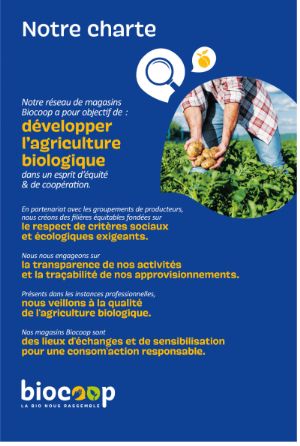 Biocoop est avant tout un réseau d’acteurs indépendants, militants, engagés. Pour affirmer leurs principes fondateurs, les magasins Biocoop ont établi une charte sur laquelle repose l'ensemble de leurs activités.