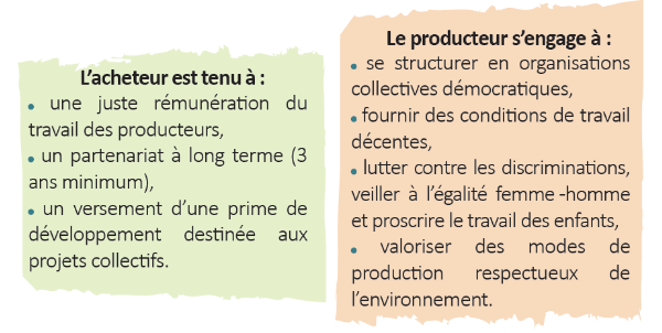 Avec les produits à marque Biocoop, la coopérative Biocoop s’est imposée comme ligne directrice que « tout ce qui peut être équitable doit l’être ». La coopérative a donc structuré des groupements de producteurs, Nos Paysan·ne·s Associé·e·s, les échanges avec ces derniers sont guidés par ceux du commerce équitable (cf. p.12).