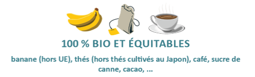 La banane, le café, le cacao et le sucre sont exclusivement issus du commerce équitable à la fois comme produits brut que dans les produits transformés. Ainsi dans les magasins Biocoop, vous ne trouverez pas de tablette de chocolat sans cacao et sucre d'origine équitable.