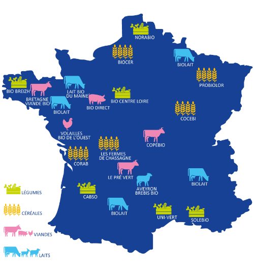 Nos Paysan.ne.s Associé.e.s à Biocoop sont des producteurs et productrices installés en agriculture 100 % biologique et paysanne. Ils représentent 3500 fermes à taille humaine en France, structurées en 20 groupements dans 4 filières de production : fruits et légumes, céréales et protéagineux, lait et produits laitiers, viande.