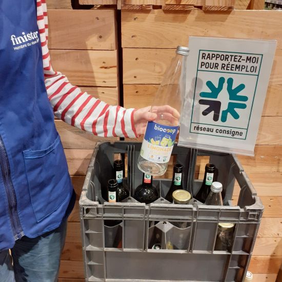 • Le réemploi : c’est désormais une obligation du cahier des charges de Biocoop qui s’applique aux magasins dès la présence d’un opérateur à proximité. Chez Finisterra, nous travaillons avec la coopérative Distro qui récupère, lave, et remet dans le circuit de distribution les bouteilles aptes au réemploi d’une partie de nos boissons. Une bouteille en verre consignée peut être réutilisées 20 fois, pour une économie de gaz à effet de serre de 79 % par rapport à une bouteille recyclée qui elle, nécessite d’être fondue à 1500°C pendant 24h !