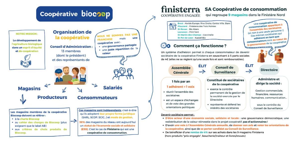 Finisterra est une coopérative de consommation de type société anonyme avec Directoire et Conseil de Surveillance (CS), composée de 9 magasins dans le Finistère nord. Finisterra est sociétaire de la coopérative Biocoop, au sein de laquelle les magasins sont indépendants et libres de choisir leur statut juridique et leur propre modèle d’entreprise.
